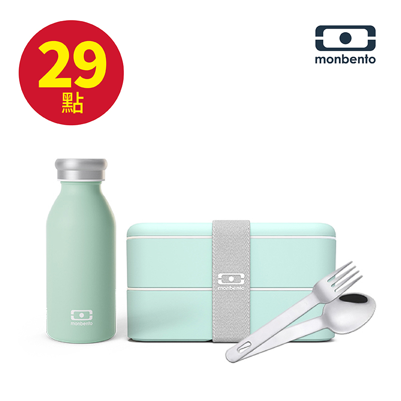- 法國Monbento雙層便當盒+牛奶瓶-馬卡龍綠+304環保餐具