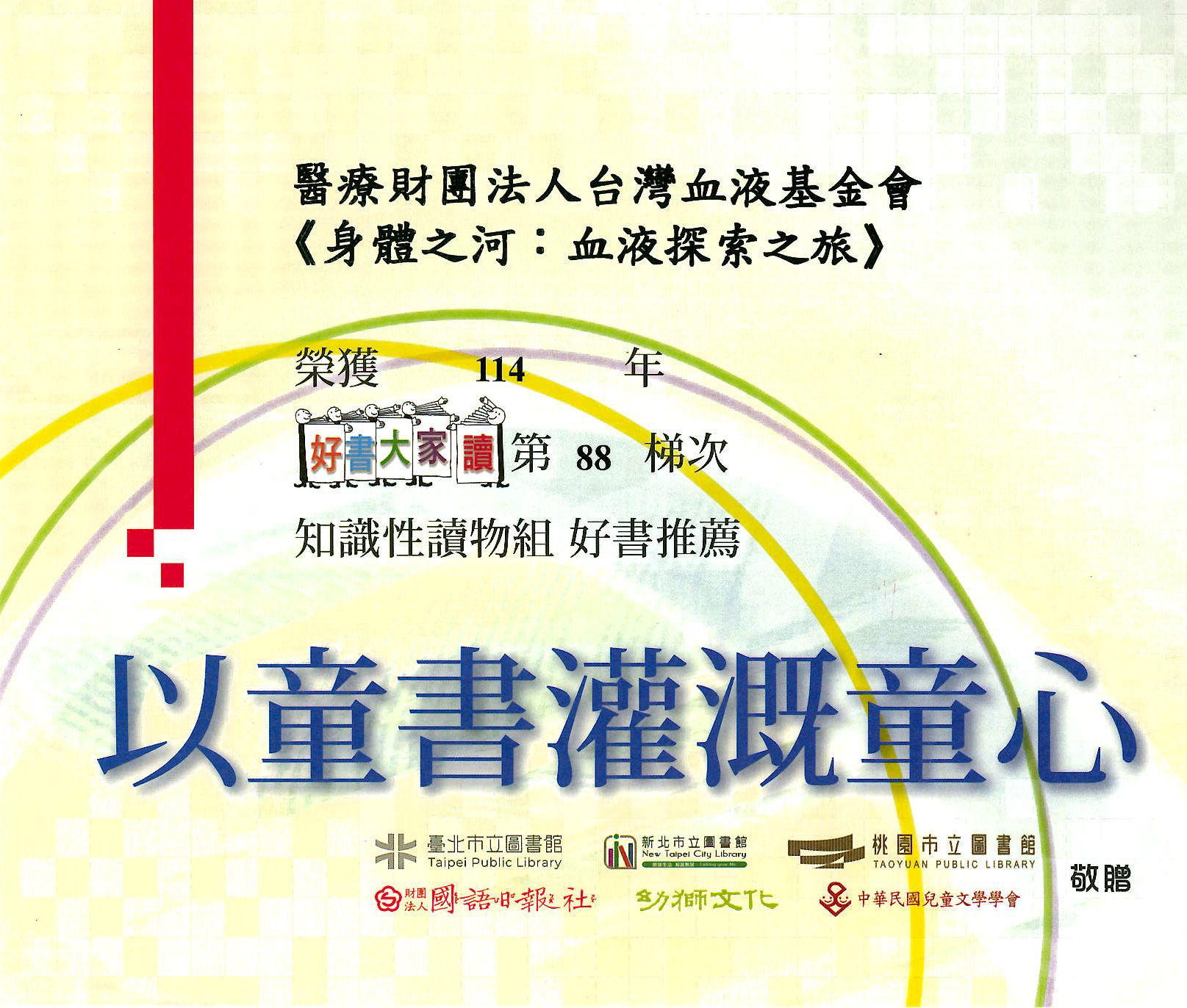 《身體之河:血液探索之旅》榮獲「好書大家讀」推薦台灣血液基金會於114年出版之《身體之河:血液探索之旅》獲得「好書大家讀」第88梯次推薦。「好書大家讀」每半年推出一次推薦書單,由臺北市立圖書館、新北市立圖書館、桃園市立圖書館聯合主辦、國語日報社、幼獅文化、中華民國兒童文學學會協辦的推廣好書活動。