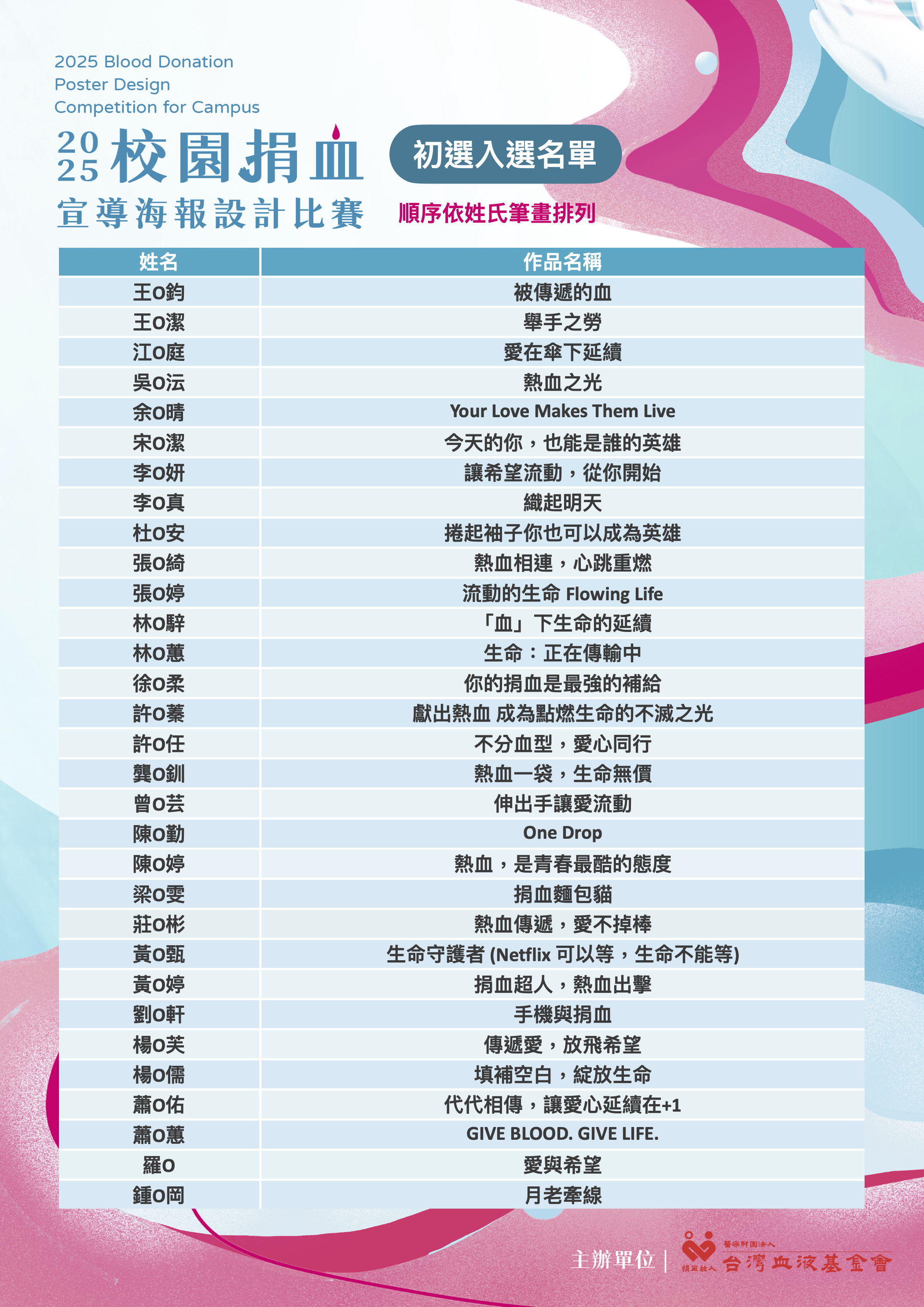 「114年校園捐血宣導海報設計比賽」共收進550件作品,經過評審群謹慎選評,最終評選出入選作品31件,將在12月下旬進行決選。