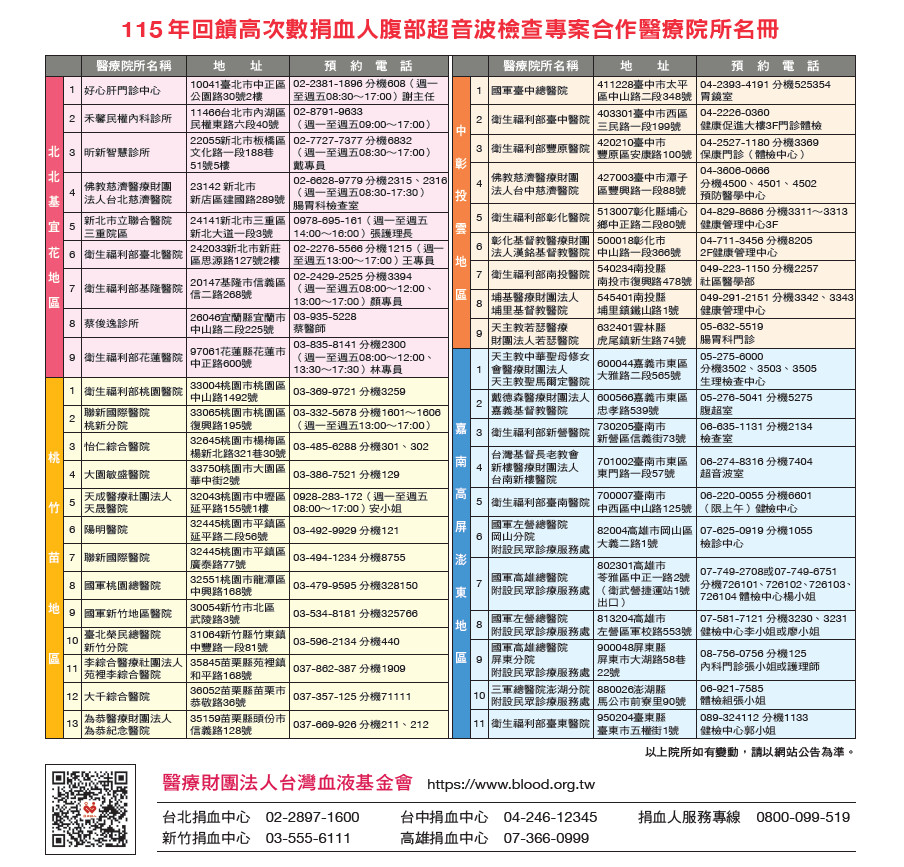 1.您可參考本通知函上所印製的醫療院所名冊,或上各捐血中心官網查詢各地區合作提供腹部超音波檢查之醫療院所,或者去電您所屬的捐血中心詢問。